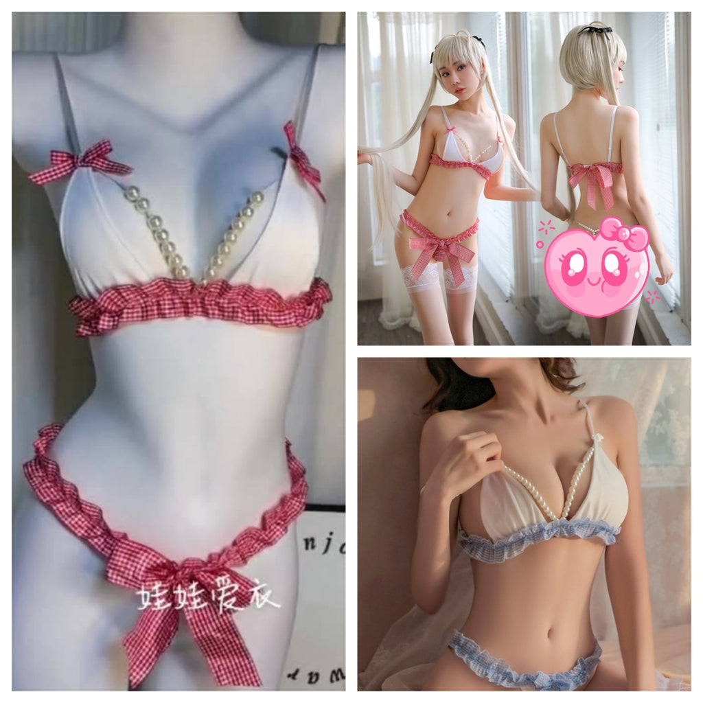三點式 珍珠丁字褲套裝 1323 (粉色格,藍色格)