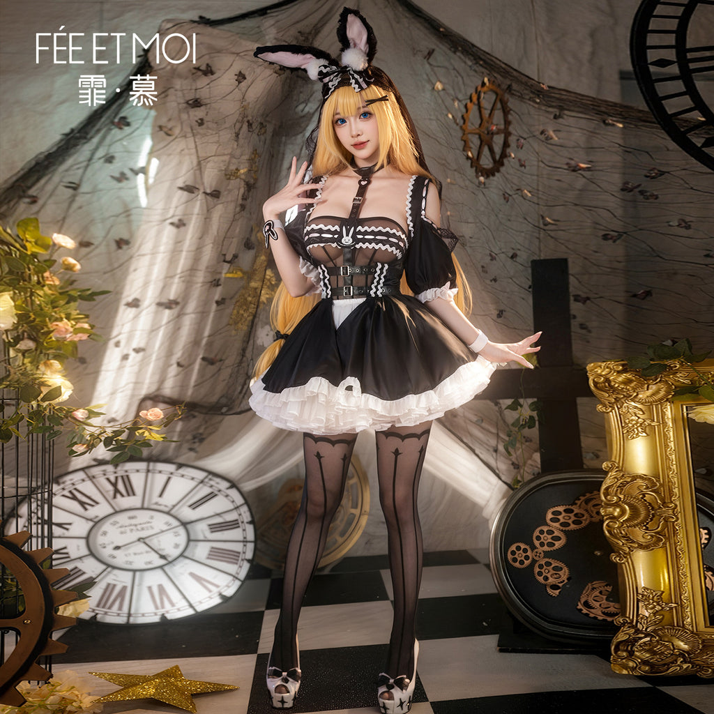 黑+白【髮箍+頭紗+手環*2+透明背帶+皮條連體衣+抹胸綁帶+連衣裙+裙撐】