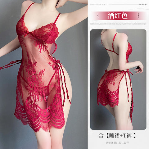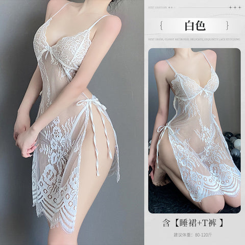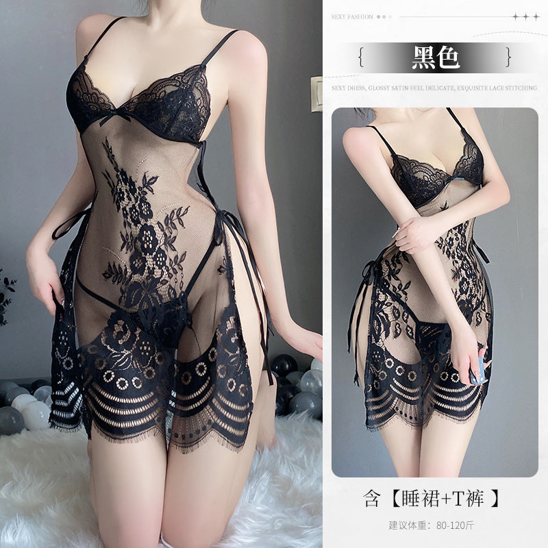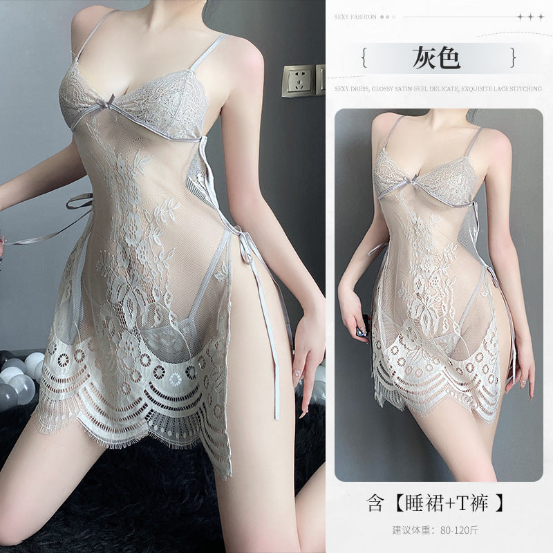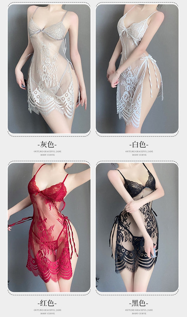 側開透視吊帶睡裙 8224 (灰色,黑色,酒紅色,白色)