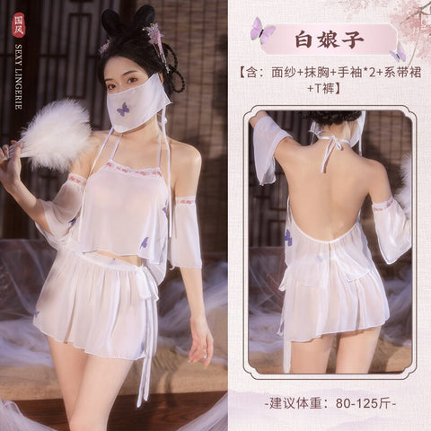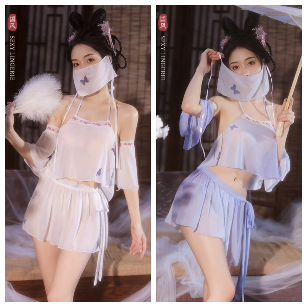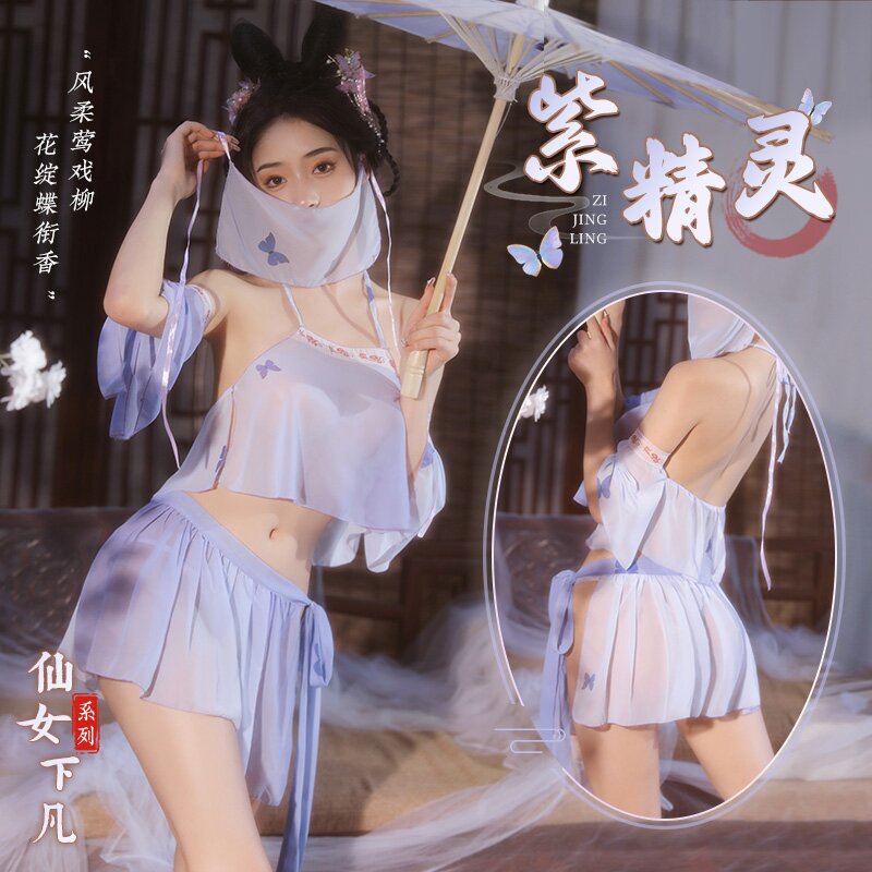 紫色精靈◆紫 【面紗+抹胸+手袖*2+繫帶裙+T褲】白娘子◆白 【面紗 抹胸 手袖*2 繫帶裙 T褲】尺寸 均碼面紗 綁帶式衣長 26 (不含掛脖)袖口 22-26 (魔術貼黏合)胸圍 75-100 (兩側開衩)裙腰圍 側綁帶T褲腰圍 58-93建議尺寸 S-XL建議體重 80-125斤