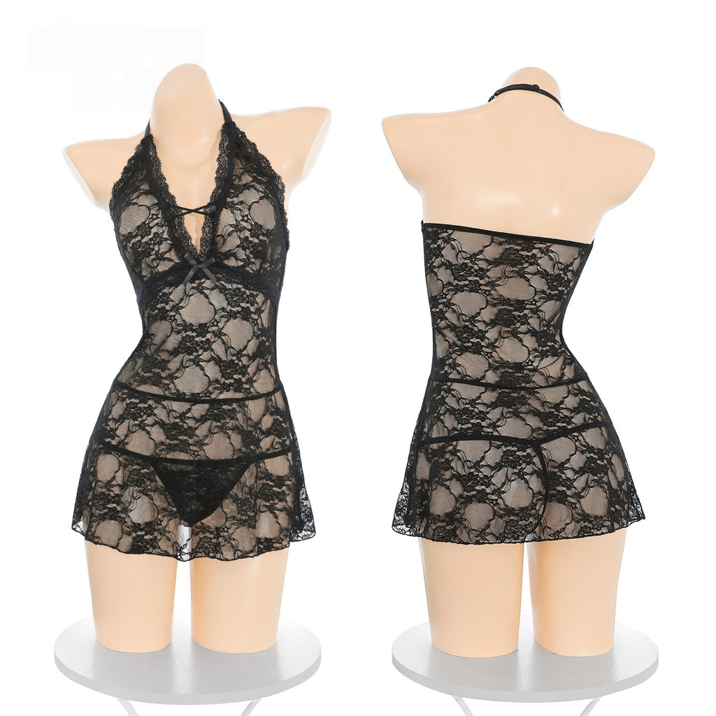 復古蕾絲掛脖包臀睡裙 6535 (白,黑)