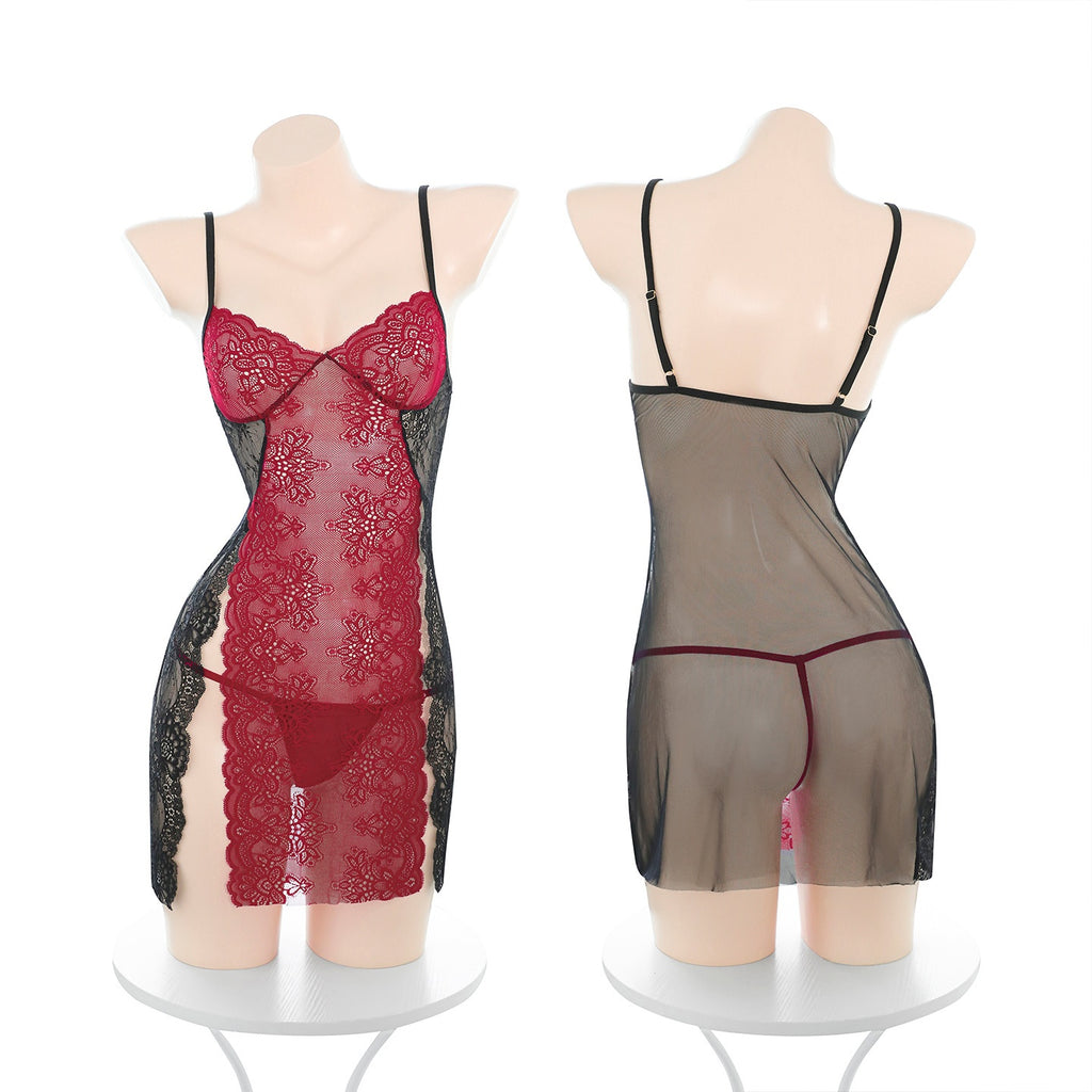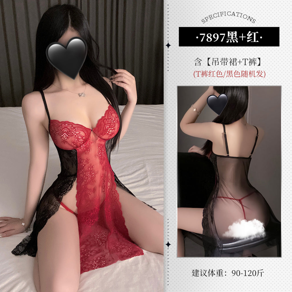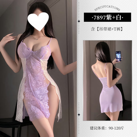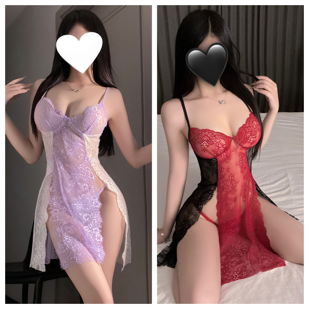 拼色蕾絲開衩吊帶睡裙 7897 (紫+白,黑+紅)