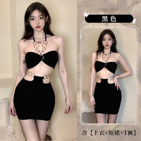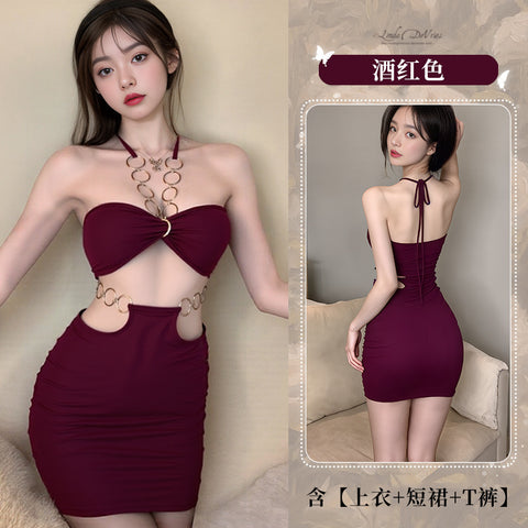 掛脖金屬環露背抹胸後媽包臀裙 6606 (黑色,紅色)