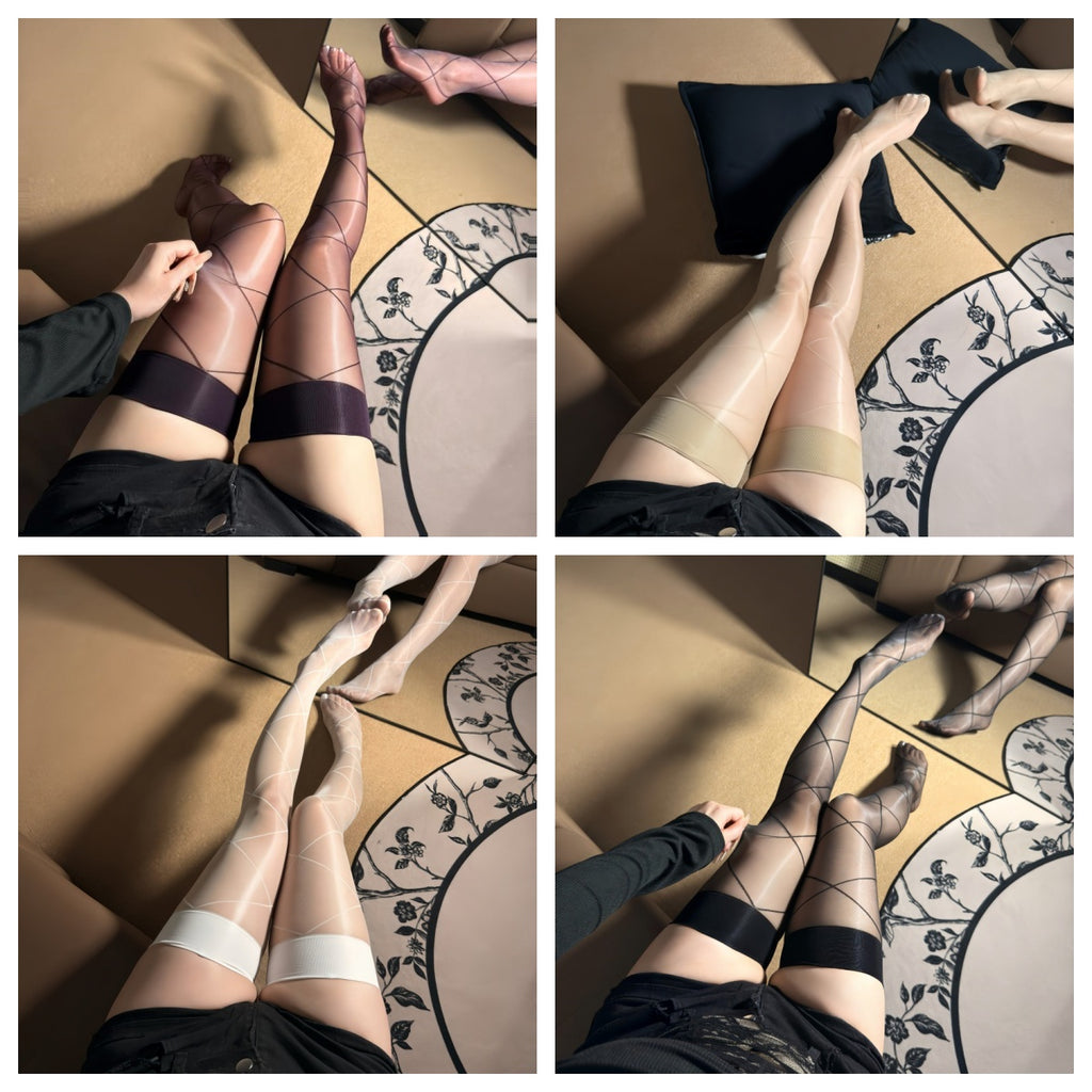 極光油亮超薄交叉網格過膝絲襪 (黑,白,膚,紫) JGO8917