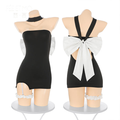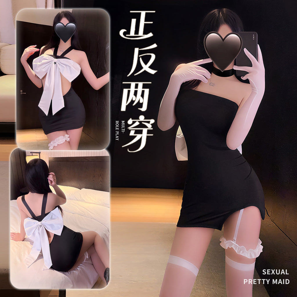 尺寸 均碼掛脖 78衣長 52 (不含掛脖)胸圍 68-92腰圍 62-98臀圍 74-108腿環圍 34-74 (可拆卸)T褲腰圍 50-90建議體重 80-120◆千金蜜情◆黑+白【連衣裙+腿環+T褲】
