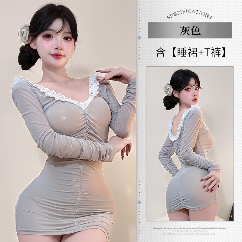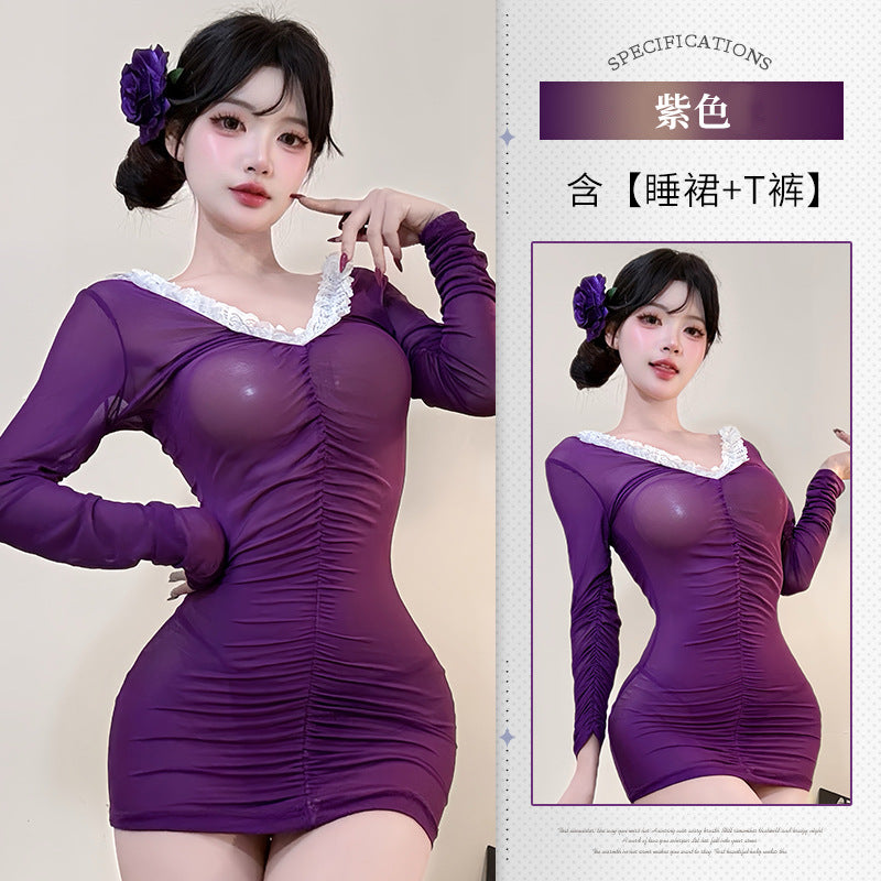 深V透視蕾絲花邊包臀裙 8374 (灰色,紫色)