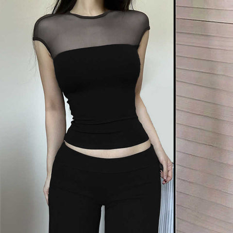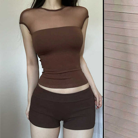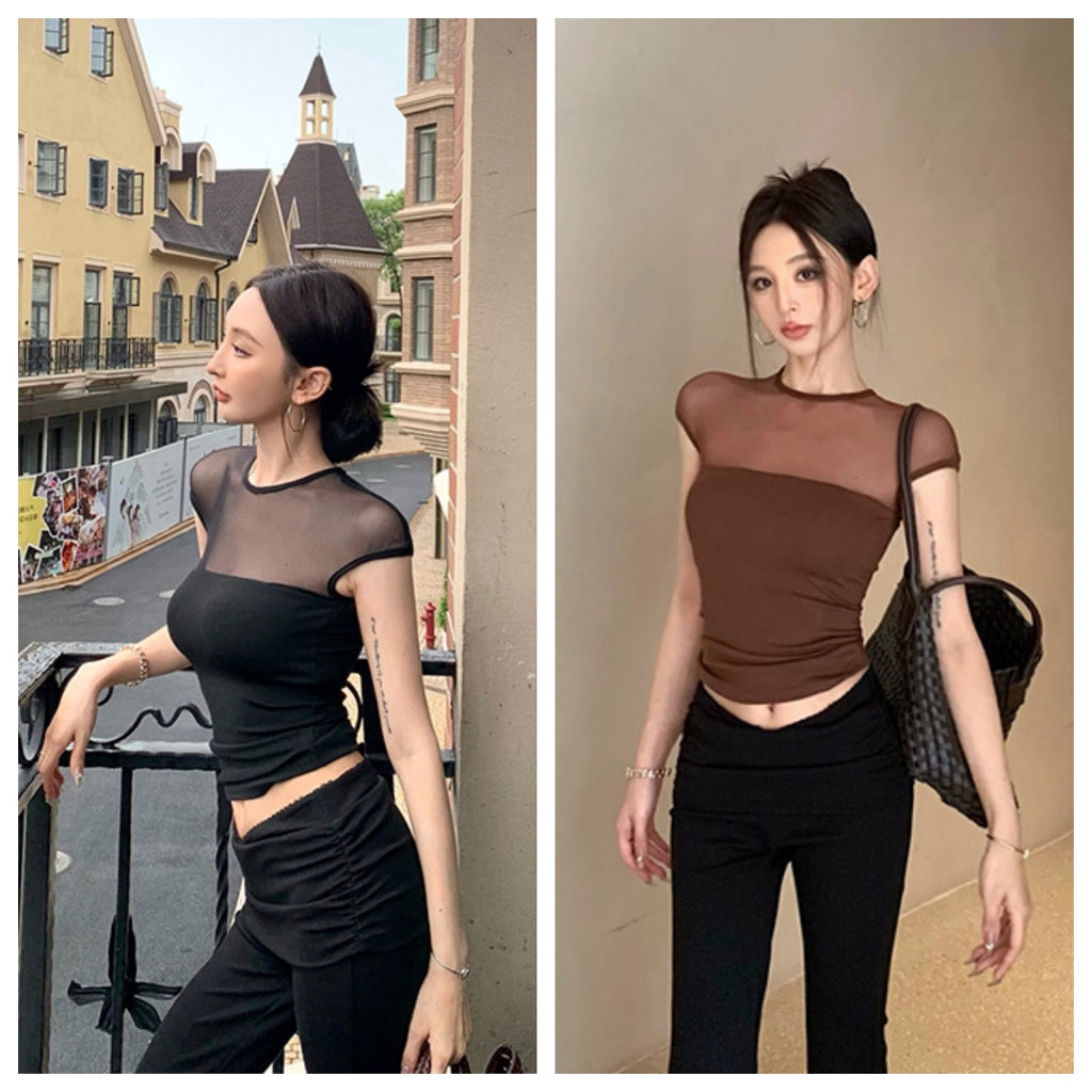 網紅 美式復古網紗拼接圓領短袖T A9391 (啡色,棗紅,黑色) (S,M,L,XL)