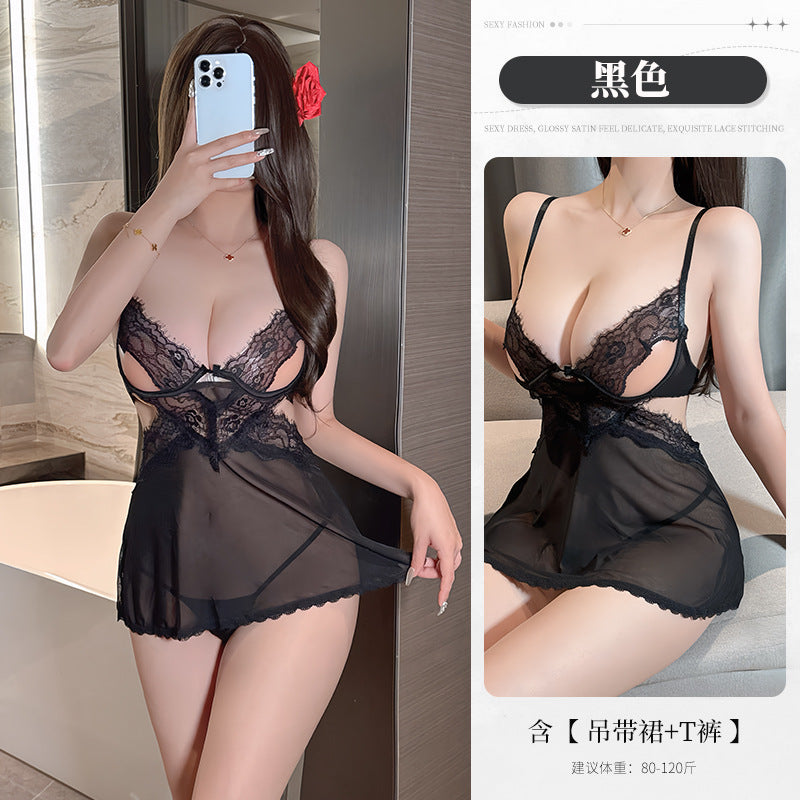 網紗透視吊帶蕾絲睡衣 8326 (黑色,杏色,白色)
