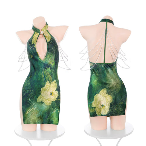 ◆墨荷幽韻◆綠【珠鏈旗袍+T褲】