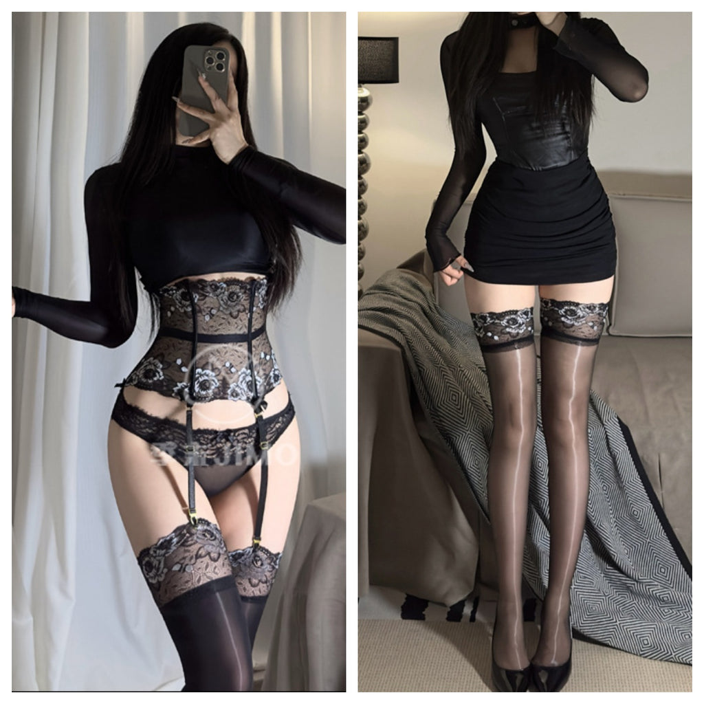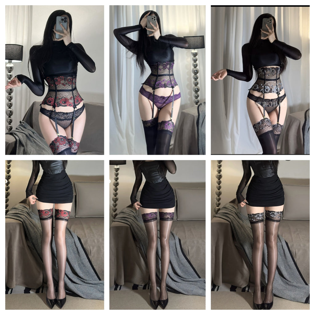 「薔薇」玫瑰蕾絲魚骨束腰塑身吊襪腰封 (3D極光/8D油光) 絲襪 7076 (黑紫,黑银,黑紅)