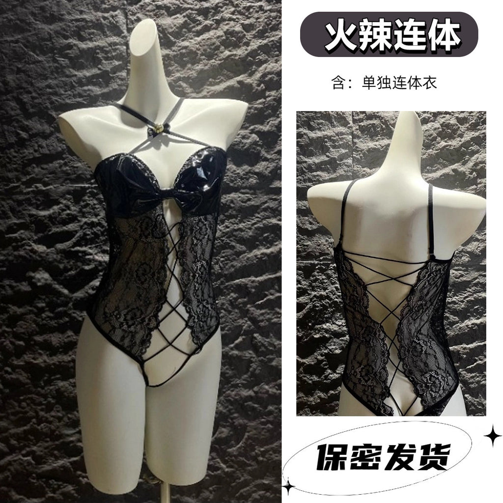 開檔交叉綁帶漆皮連身衣 4687